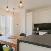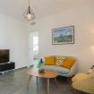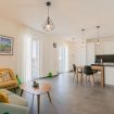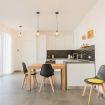 Zona giorno elegante con richiami mediterranei, cucina attrezzata con forno, piano cottura, frigorifero e macchina da caffè. Spazio perfetto per cene conviviali o colazioni lente.